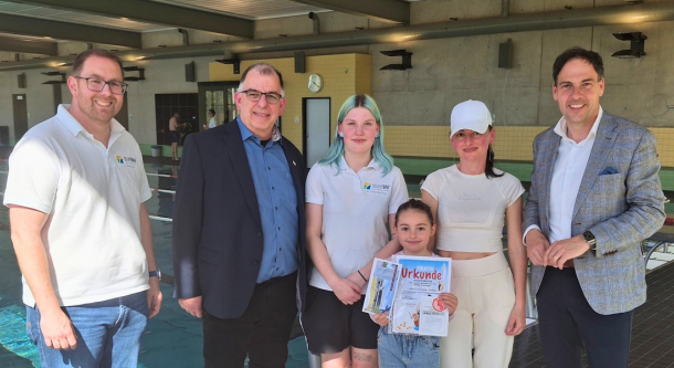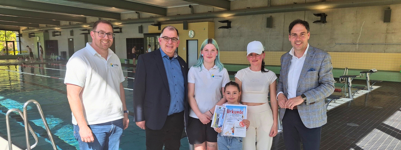 Aus diesem Anlass kamen Bürgermeister Guido Wacht, Vorsitzender des SMW-Verwaltungsrates, Ralf Zorn, Vorstand der Saar-Mosel Werke Konz AöR, Jens Becker, Betriebsleiter des Saar-Mosel-Bads, sowie das Kind und seine Mutter zu einem gemeinsamen Fototermin zusammen. Das Kind erhielt als Anerkennung einen Gutschein für das Saar-Mosel-Bad.